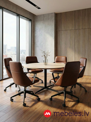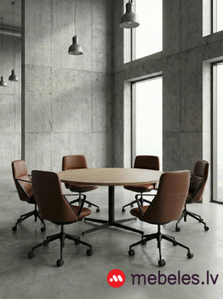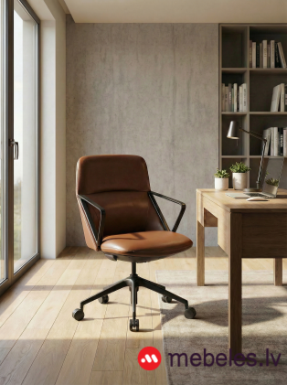 TED biroja un konferenču krēsls. Tā izsmalcinātā brūnā eko āda piešķir telpai siltumu un prestižu, savukārt melnā metāla piecstaru pamatne nodrošina stabilitāti un drošu ilgstošu lietošanu. Šis krēsls būs lieliska izvēle gan birojam, gan konferenču telpai, gan stilīgam mājas kabinetam.
